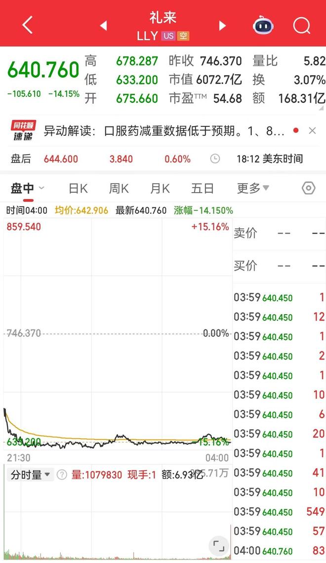 礼来股价暴跌14.15%。创自2000年8月以来最大单日跌幅,总市值为6072.7亿好意思元。